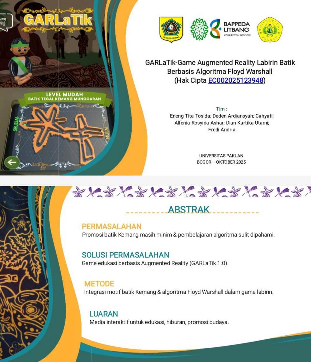 Program Studi S2 Ilmu Komputer SPs Unpak berkolaborasi dengan S1 Ilmu Komputer FMIPA, Prodi Manajemen Informasi Sekolah Vokasi dan Prodi Manajemen FEB Unpak, turut berpartisipasi pada GELAR INOVASI DAERAH 2025 yang diselenggarakan oleh Bappeda Litbang Kab. Bogor. Inovasi yang diusung adalah GARLaTik, Game Augmented Reality Labirin Batik. (6/10/25)