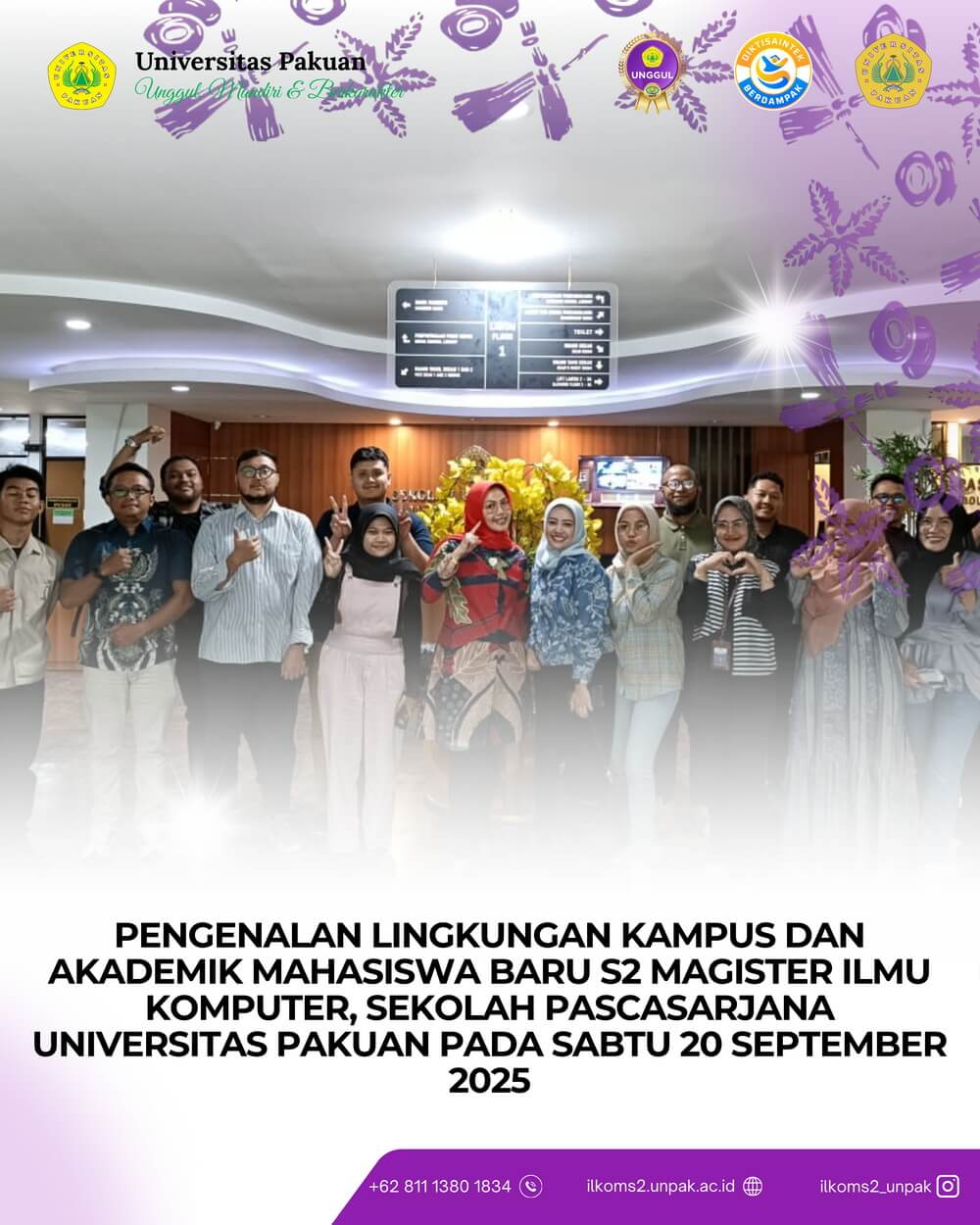 Program Studi Magister Ilmu Komputer, Sekolah Pascasarjana Universitas Pakuan menyelenggarakan kegiatan Pengenalan Lingkungan Kampus dan Akademik bagi mahasiswa baru pada hari Sabtu, 20 September 2025. Kegiatan ini bertujuan untuk memberikan pemahaman awal mengenai proses akademik, lingkungan belajar, serta mempererat kebersamaan antar mahasiswa dan dosen.